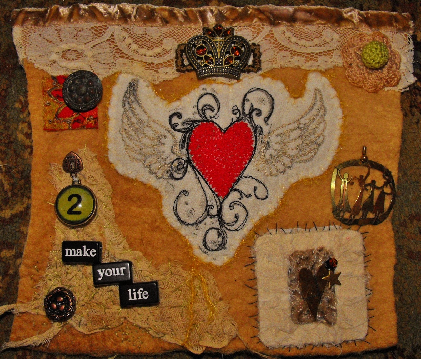 The back of the page contains a big, green velvet, garrish looking embroidered piece. This piece was something I found in a box of stuff I brought home from an auction...about 20 years ago! It was fully embroidered on a large, square of green velvet. I decided to trim the velvet to the shape of the embroidery and used a blanket stitch to attach to the canvas.